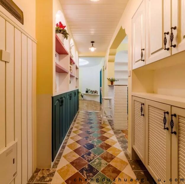 我最喜欢的是地面贴砖的花色选择和拼花方式,这种色彩搭配很考验设计师对色彩的把控能力,稍不注意可能就是败笔。但是这个过道却产生了一种难以言状的美感。整个空间色彩非常微信而又不失灵动。色彩把控刚刚好,整个空间非常呼应。两边的储物空间又可以让主人家在后期发挥自己的想象力,按照不同的心情、季节做出改变。过道既美观又实用,只要是居家的人,一般都非常喜欢这种过道的设计方式。