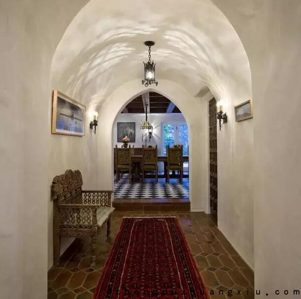 这是一个比较综合的过道设计,墙面、顶面和地面均融入了恰当的设计元素。风格气息浓郁,设计出彩。马赛克的大量使用告诉我们这家的装修费用不菲哦~~